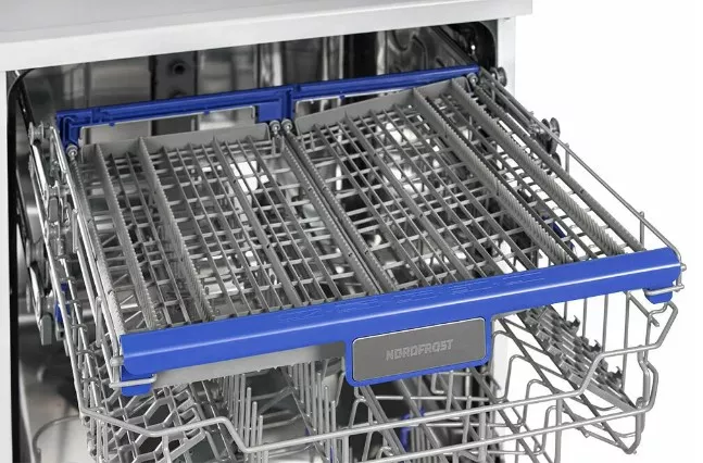 Для удобства очистки большого количества посуды в модели есть 3 уровня загрузки: верхняя корзина, нижняя и для столовых приборов.
