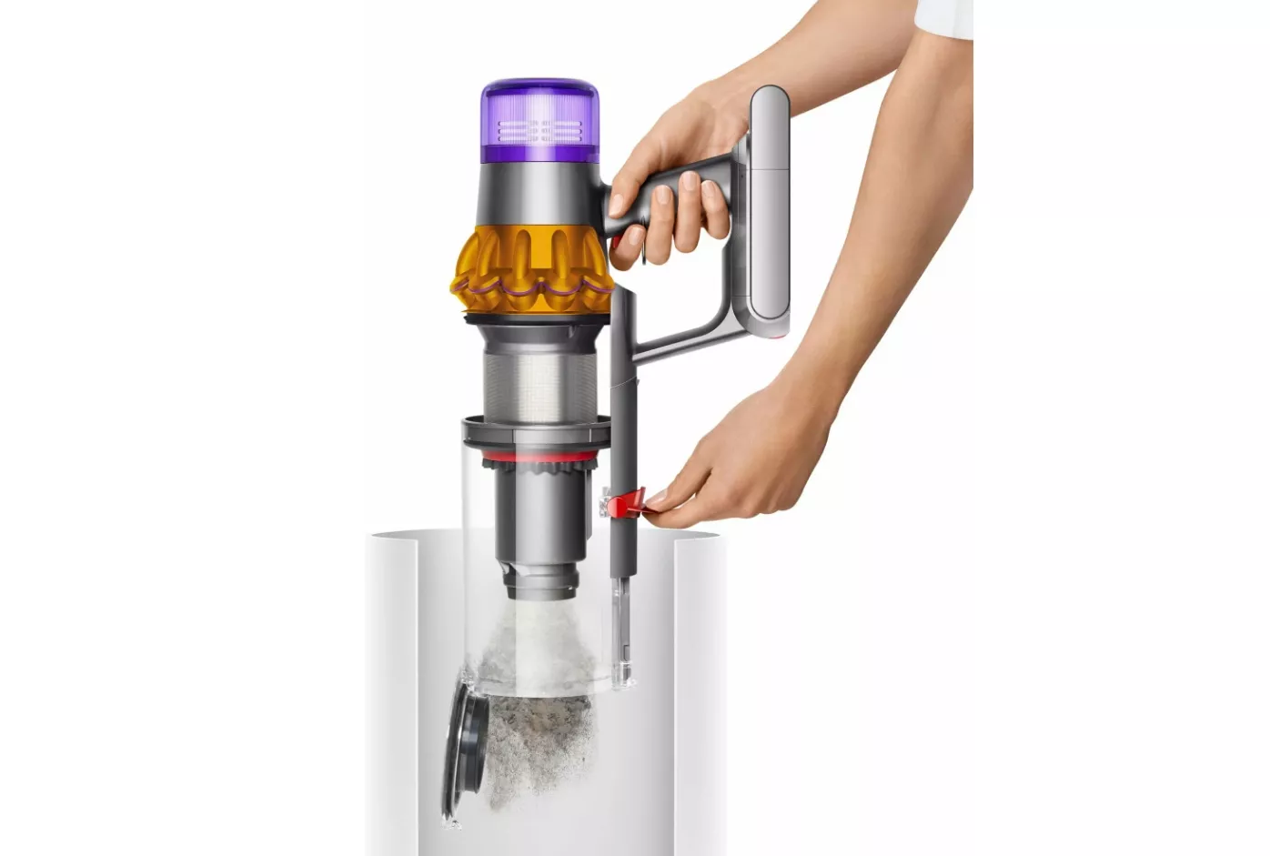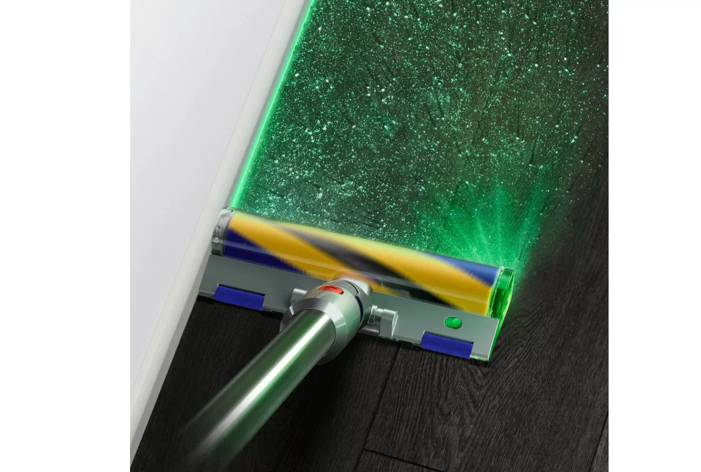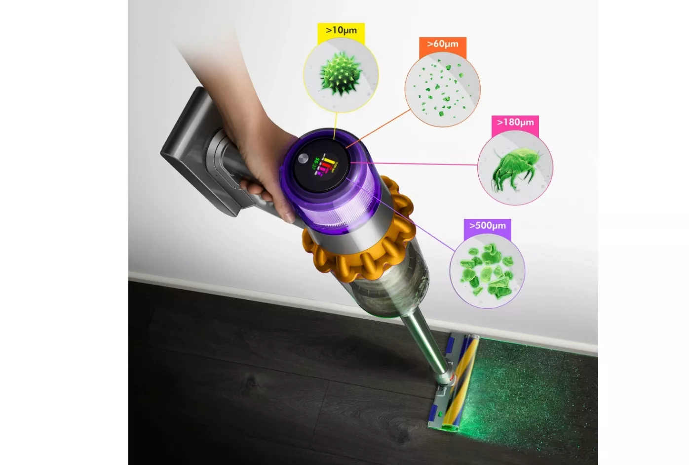 Пылесос Dyson V15 Detect Absolute снабжён зелёным лазерным лучом для подсветки невидимых частиц и ещё более качественной уборки. На жидкокристаллическом экране можно в подробностях увидеть, какие частицы попадают в пылесборник объёмом 0,77 литра.