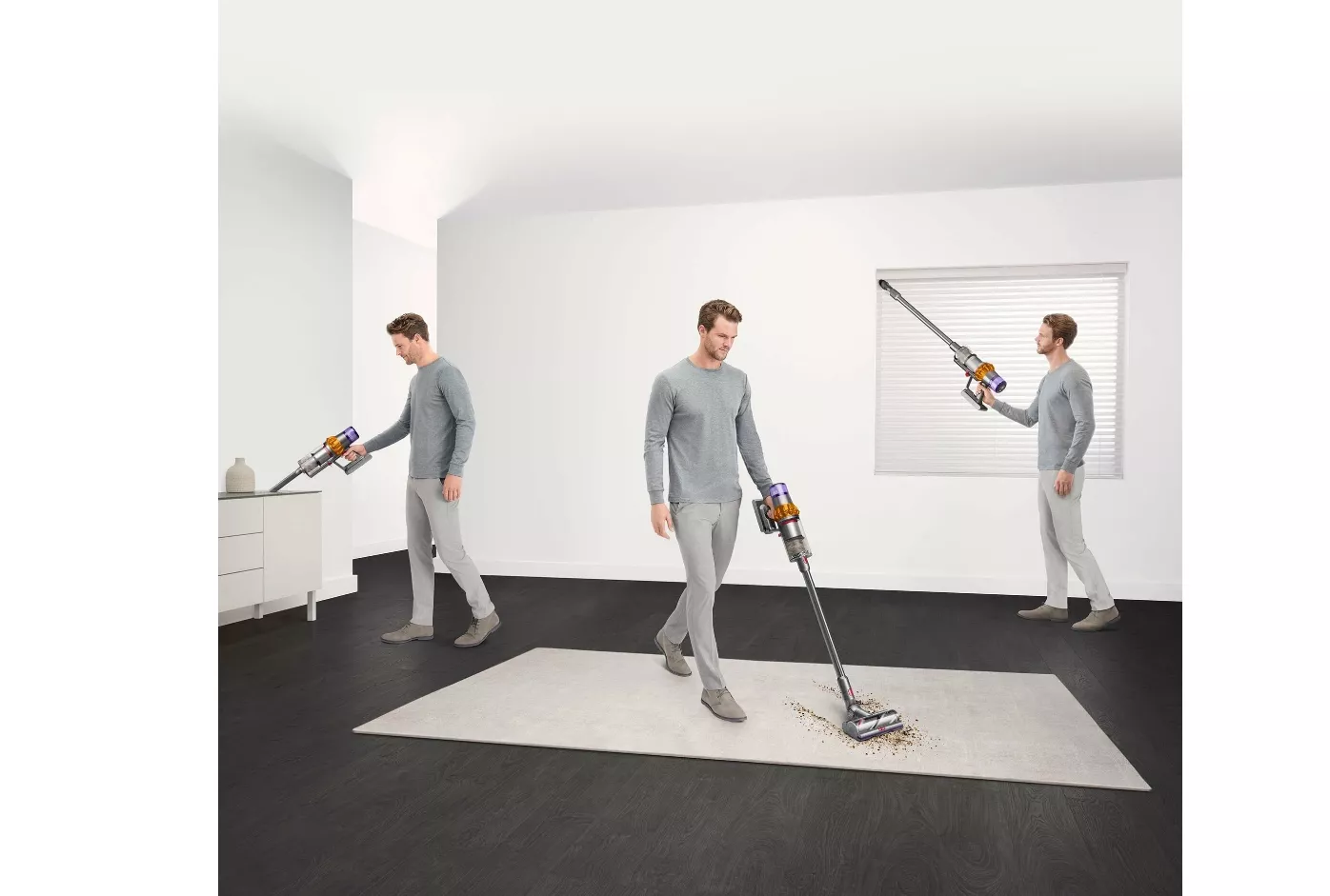 Dyson V15 Detect Absolute оснащён аккумулятором ёмкостью 3 600 мА·ч, который позволяет использовать его без привязки к розетке и обеспечивает до 60 минут работы без подзарядки. Для удобства использования беспроводной пылесос также оснащён LED-подсветкой для уборки в темноте и индикатором уровня заряда батареи. Эргономичный корпус Dyson V15 выполнен из прочных материалов, которые не подвержены царапинам. Компактные размеры позволяют легко хранить пылесос и перемещать его по квартире.