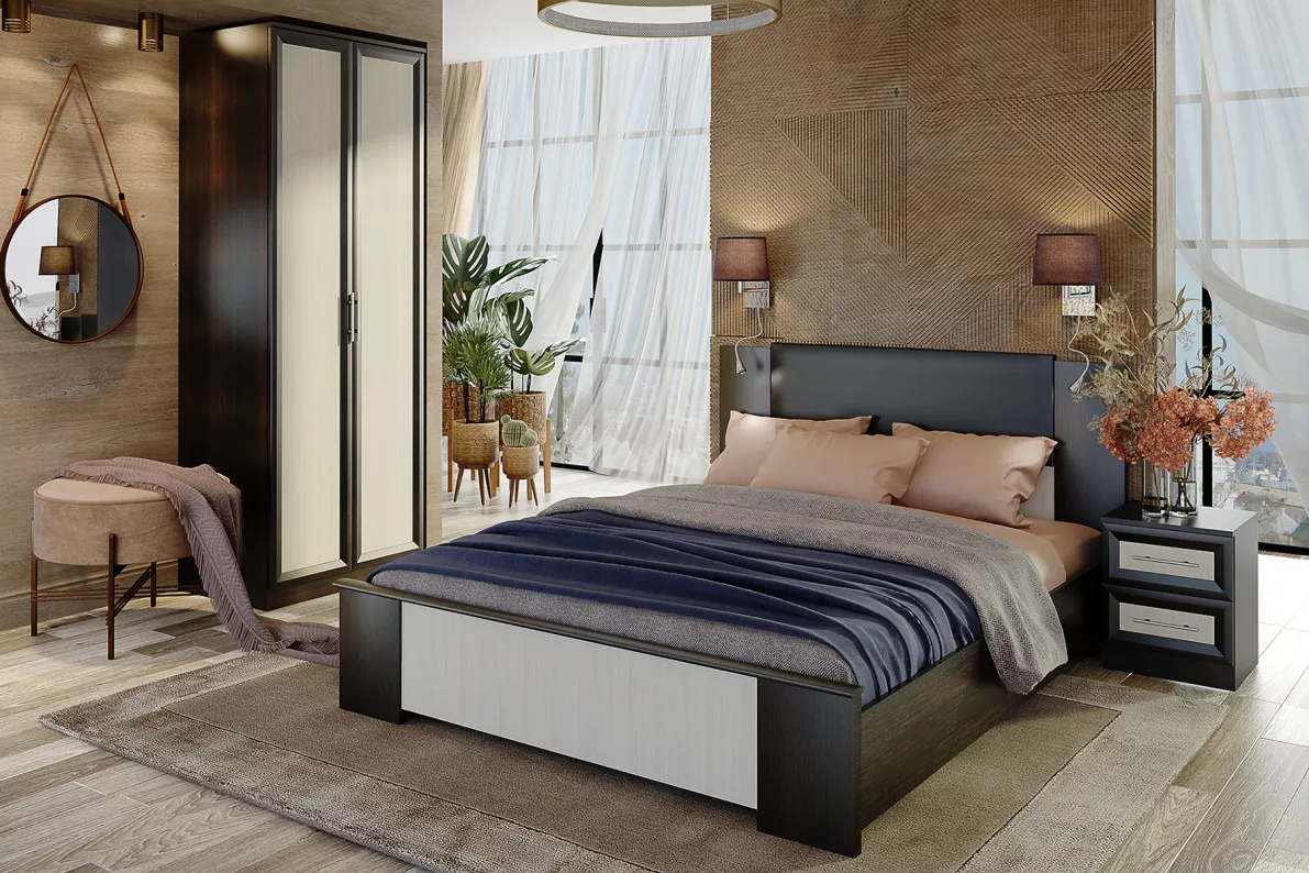 Совместно с гарнитуром советуем приобрести ортопедическое основание для кровати соответствующего размера и матрас, который будет идеально соответствовать анатомическим особенностям хозяев. При желании функционал интерьера можно дополнить еще одной тумбочкой, компьютерным столом, креслом и т.д.