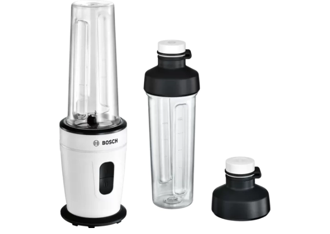И корпус блендера, и его емкость выполнены из надежного пластика, а рабочая часть – из металла. Благодаря прочному ножу-измельчителю прибор позволяет даже крошить лед для десертов и коктейлей. Bosch MMBM401W укомплектован 2 бутылочками по 500 мл, в которых можно готовить и брать с собой смузи или детское питание. Съемные части блендера можно мыть в посудомоечной машине. Дополнительные достоинства прибора заключаются в его небольших размерах (32.7x10.4x10.4 см) и малом весе (1.3 кг).