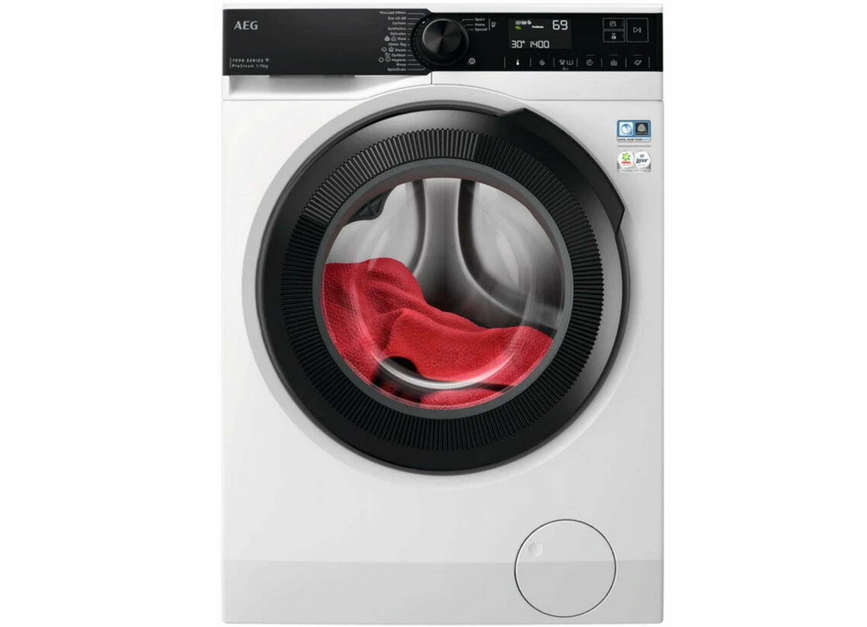 Управление осуществляется с помощью электронной панели с большим LCD-дисплеем. Поворотные сенсорные переключатели делают управление интуитивно понятным и удобным. Модель также оснащена функцией отсрочки старта, контролем пенообразования и датчиком веса, который оптимизирует расход воды и энергии в зависимости от веса загруженного белья.