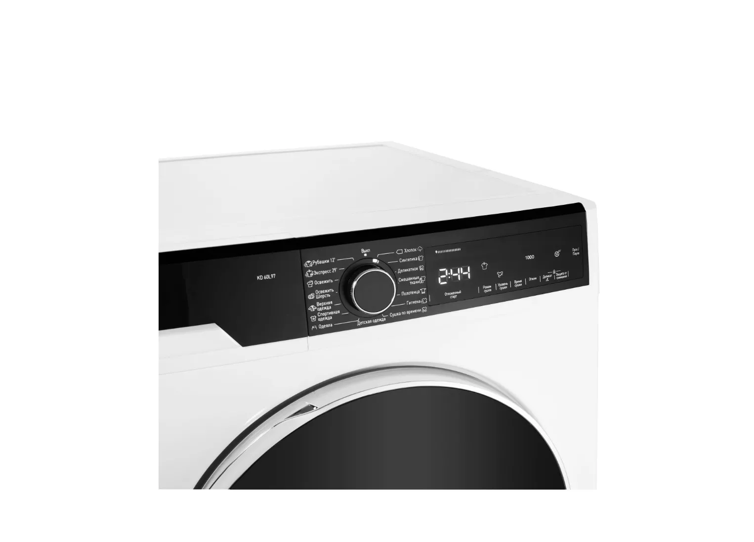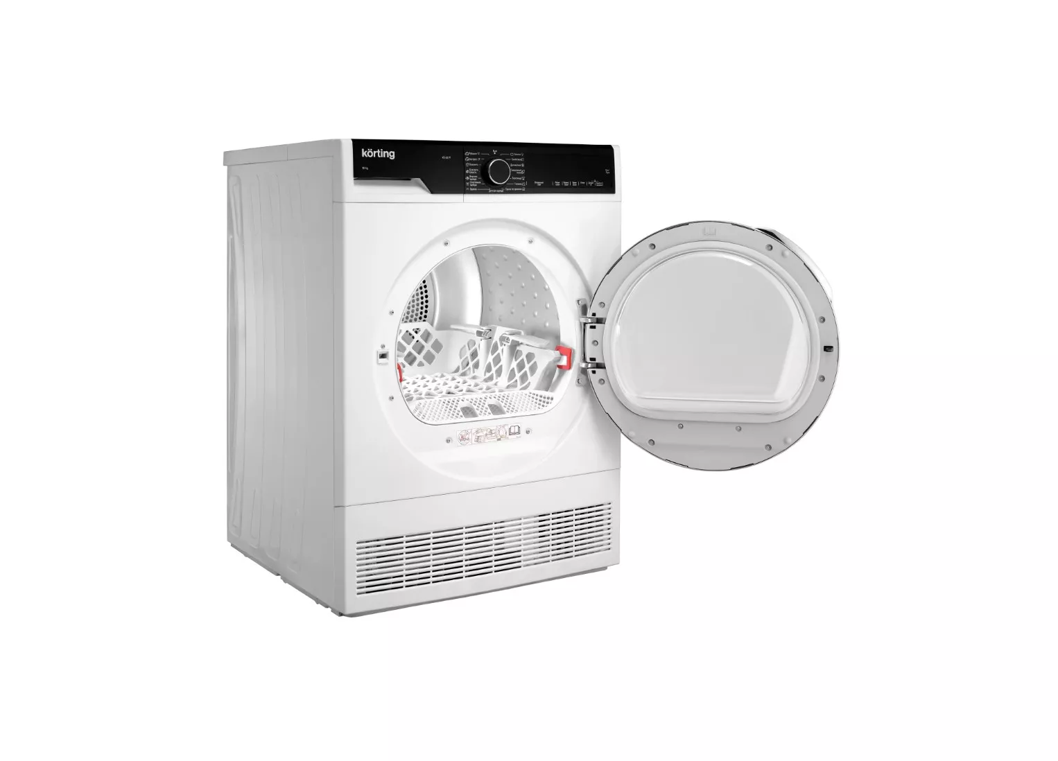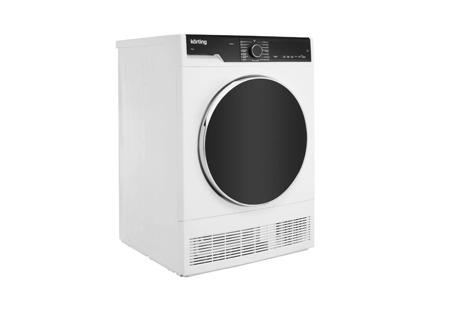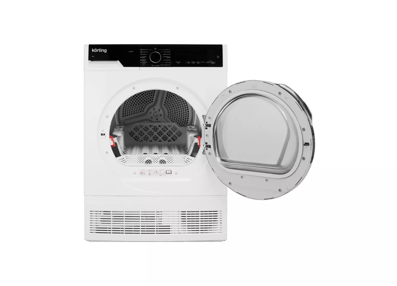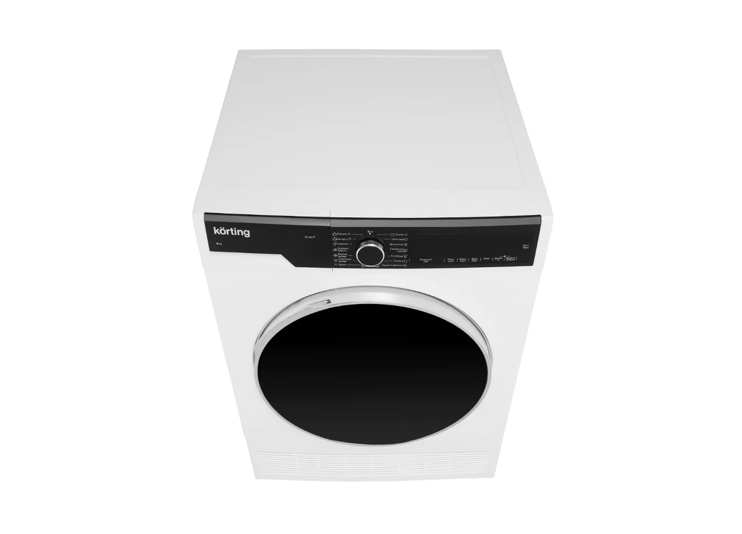 Сушильная машина Korting KD 60L97 — вместительная конденсационная сушилка на 10 кг с барабаном 120 л, 15 программами и сенсорным управлением, рассчитанная на семью и установку в колонну со стиральной машиной.