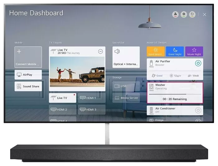 В LG OLED65WX9LA реализована платформа Smart TV под управлением операционной системы WEB OS с интуитивным пользовательским интерфейсом. Коммуникационные возможности представлены широким набором проводных и беспроводных интерфейсов. Вместе с телевизором поставляются стандартный пульт ДУ и пульт ДУ Magic Remote.