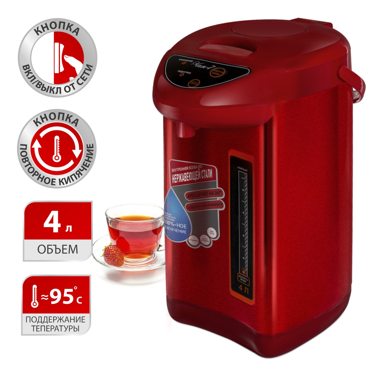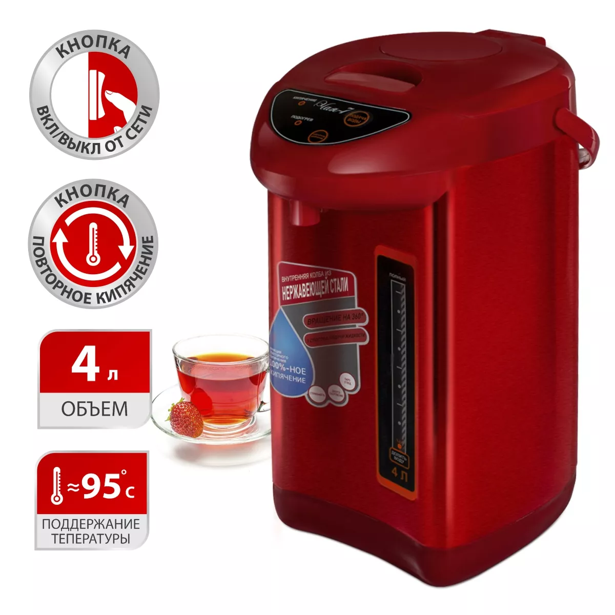 Термопот Великие Реки Чая-7 выполнен в ярком корпусе красного цвета и является необходимым устройством для большой семью, где любят кофе и чайный напиток. Особенность этого прибора в сочетании двух функций: о позволяет вскипятить воду как чайник и сохранить ее температуру, выполняя функцию термоса. Это позволяет в любое время приготовить настолько горячий напиток, будто вода только вскипела. Объем термопота достигает 4 литра, поэтому он позволит в течение дня не добавлять воду.
