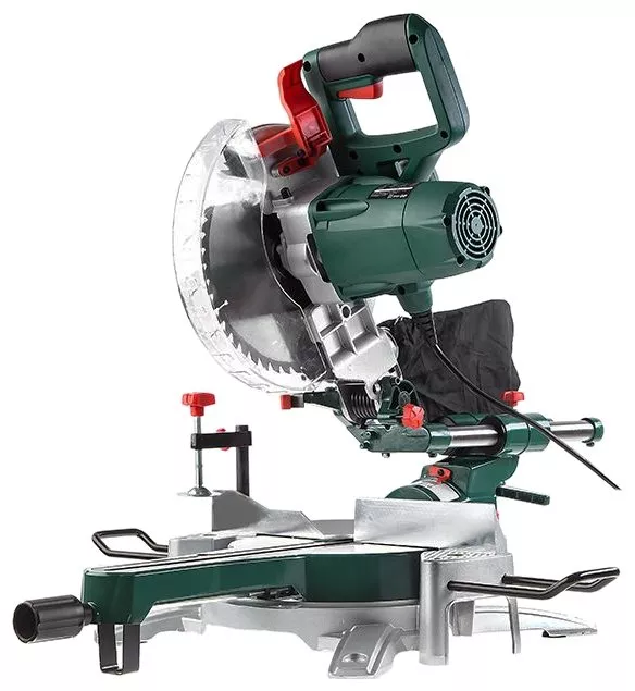 удлинитель поддержки заготовки – 2шт., струбцина прижима заготовки, мешок пылесборный, диск пильный, ключи |
