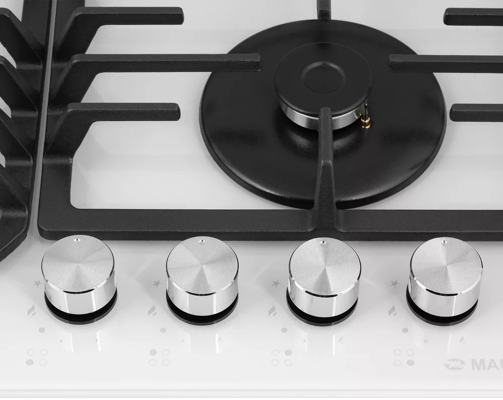 Газовая варочная поверхность MAUNFELD EGHG.64.43CW/G выполнена в лаконичном дизайне, что станет отличным дополнением для вашего кухонного интерьера. Минималистичные хромированные ручки обеспечивают удобство при включении и регулировке силы огня благодаря встроенному электрическому поджигу, а за счет своего удаления от рабочих зон исключается возможность случайно обжечься. Также для большей безопасности использования данная модель плиты оснащена системой контроля газа, автоматически блокирующей его поступление при обнаружении утечки.