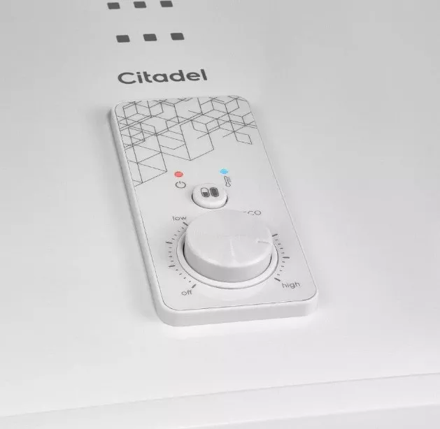 Прибор работает в широком температурном диапазоне: с помощью удобной механической панели управления вы можете выбрать любое значение от 30 до 75 градусов, активировать функцию быстрого нагрева или половинной мощности. Кроме того, Citadel обладает индикаторами нагрева и работы, чтобы вы самостоятельно контролировали уровень температуры и состояние прибора. Также прибор оснащён многоступенчатой системой безопасности: