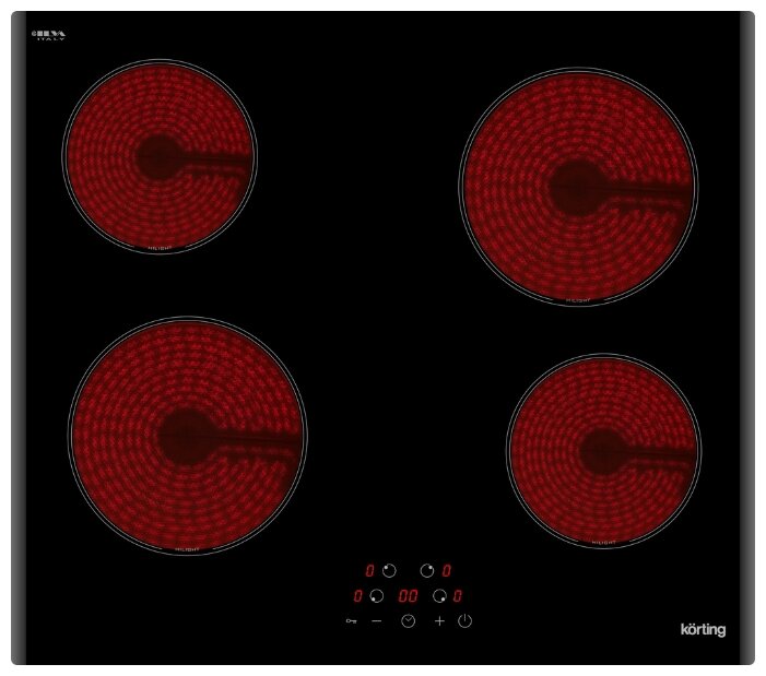Электрическая варочная панель Korting HK 60003 B — это классическая стеклокерамическая «четвёрка» 60 см с HiLight‑нагревателями, 9 уровнями мощности и сенсорным управлением, ориентированная на тех, кому нужна простая и надежная электрическая поверхность без индукции.
