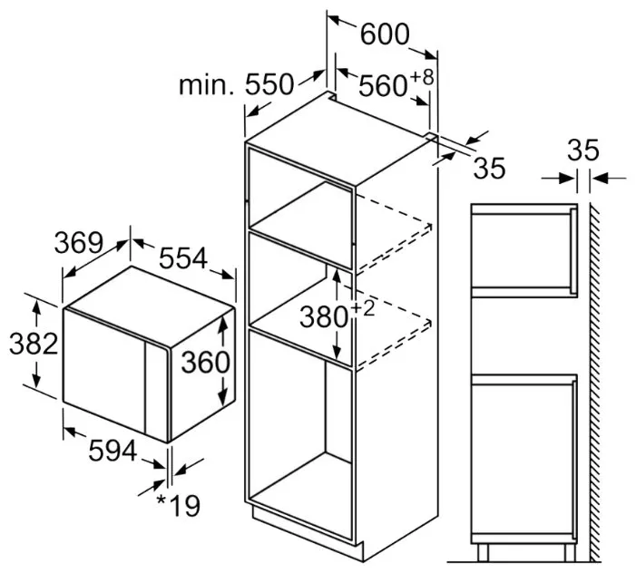 длина сетевого кабеля 130 см, потребляемая мощность 1450Вт, напряжение 220-230В, размеры ниши для встраивания (ВхШхГ) 380-382x560-568x550 мм; количество режимов авторазморозки: 4, часы, светодиодное освещение