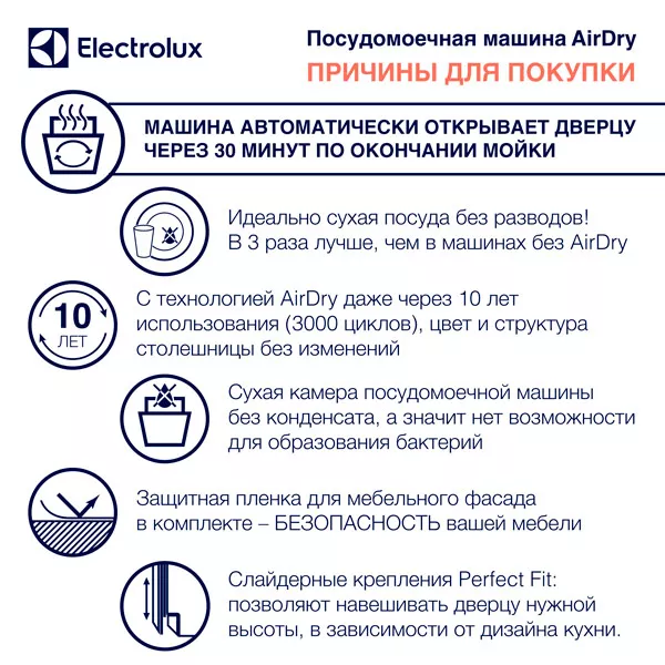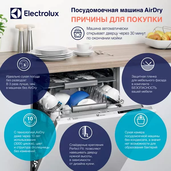Встраиваемая посудомоечная машина Electrolux ESL94320LA позволит максимально облегчить процесс мытья посуды. Данная модель посудомоечной машины обладает вместимостью до 9 комплектов посуды, а расход воды составит 10 литров за один цикл. В зависимости от выбранной программы (их всего 5) температура воды для мытья составит от 45 °C до 70 °C. Особенностью посудомоечной машины является технология AirDry, благодаря которой посуду можно сразу же после полного завершения процесса мытья (включая сушку) убирать в шкаф.