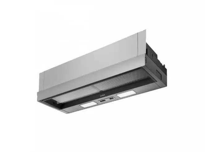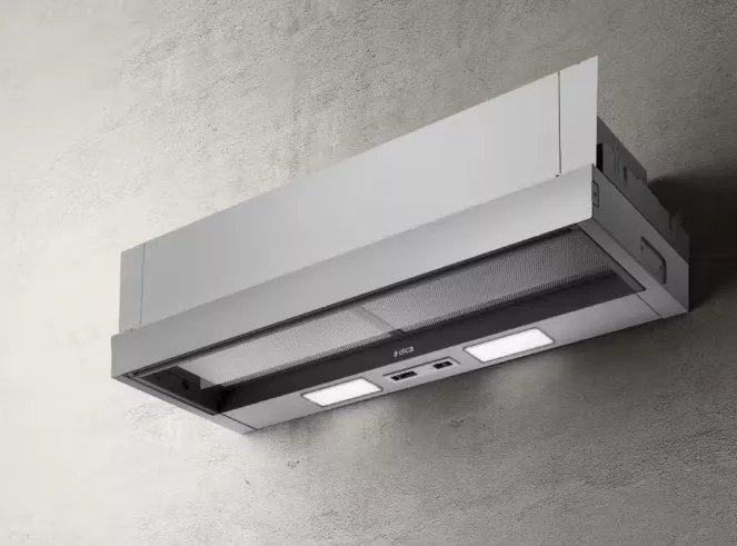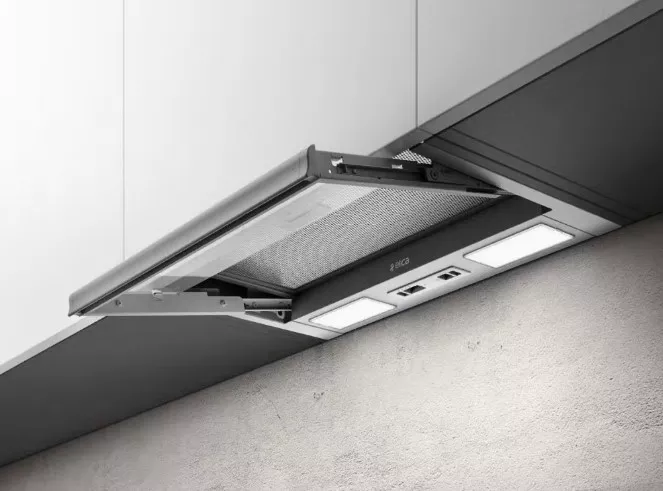 Конструкция является выдвижной: во время работы вы просто выдвигаете козырек, увеличивая площадь всасывания за счет технологии периметрального всасывания. Это не только повышает эффективность захвата загрязненного воздуха по краям, но и придает технике футуристичный вид. После окончания работы вытяжка компактно прячется в шкафу, экономя пространство и сохраняя эстетику кухни.