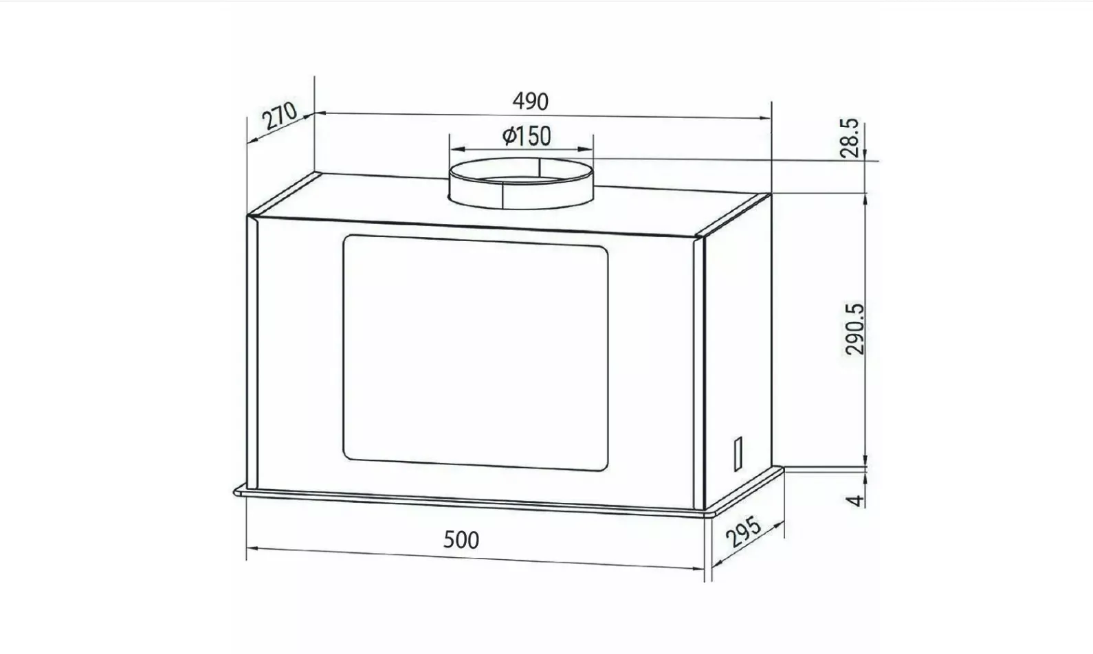 Диаметр воздуховода 150 мм; габариты (Ш×Г×В) около 52 × 29,5 × 32,4 см, встраиваемые размеры примерно 49,5 × 27 × 29,05 см.