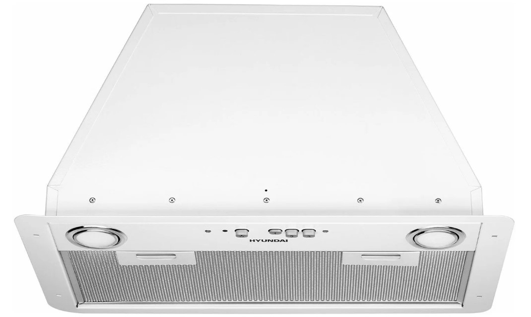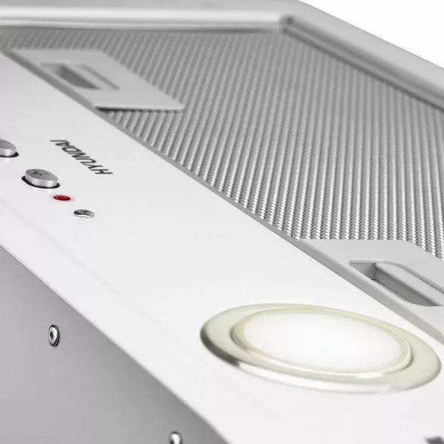 Большим плюсом встраиваемой кухонной вытяжки HYUNDAI HBB 6035 W является то, что корпус прибора полностью спрятан в кухонном шкафу – видна только панель управления с кнопками и алюминиевый моющийся жироулавливающий фильтр.