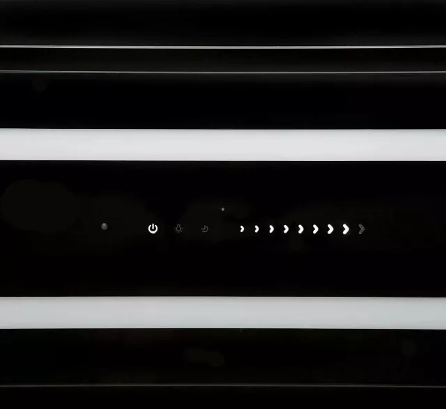 Дизайн вытяжки выдержан в едином стиле арт-нуво, который характеризуется отсутствием привычных острых углов. В этом стиле все линии плавные, края стеклянного фасада, стеклянной панели, полос освещения, слайдера сенсорного управления скруглены.