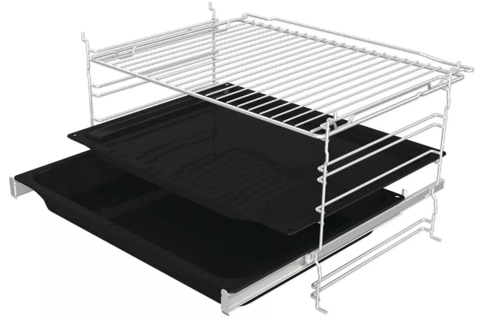 В комплект входят глубокий и мелкий эмалированные противни, решетка и телескопические направляющие для удобства использования.