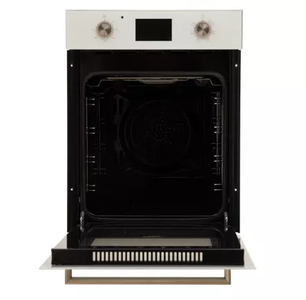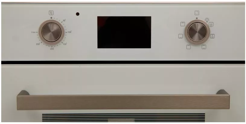 Духовой шкаф оснащен механическим поворотным переключателем и дисплеем, что делает управление интуитивно понятным. Откидная дверца духовки с двумя стеклами обеспечивает безопасность использования и удобство при очистке.