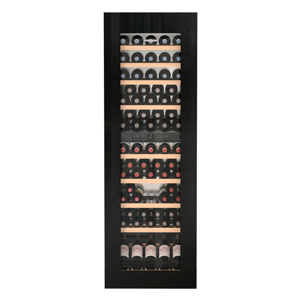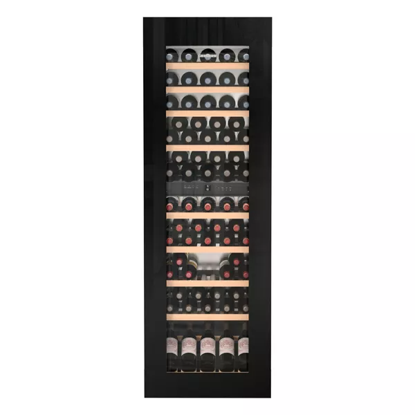 Это высокий встраиваемый винный шкаф с черным стеклянным фасадом, рассчитанный на серьёзную домашнюю коллекцию. Подходит для одновременного хранения красных, белых вин и игристых в оптимальных режимах.