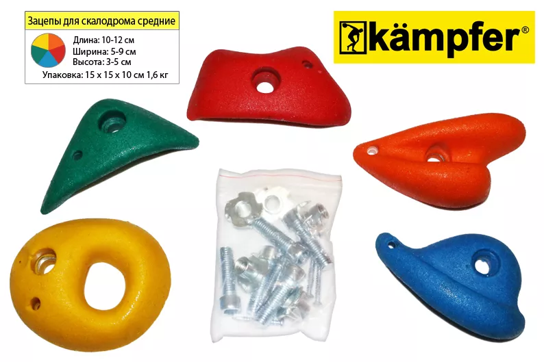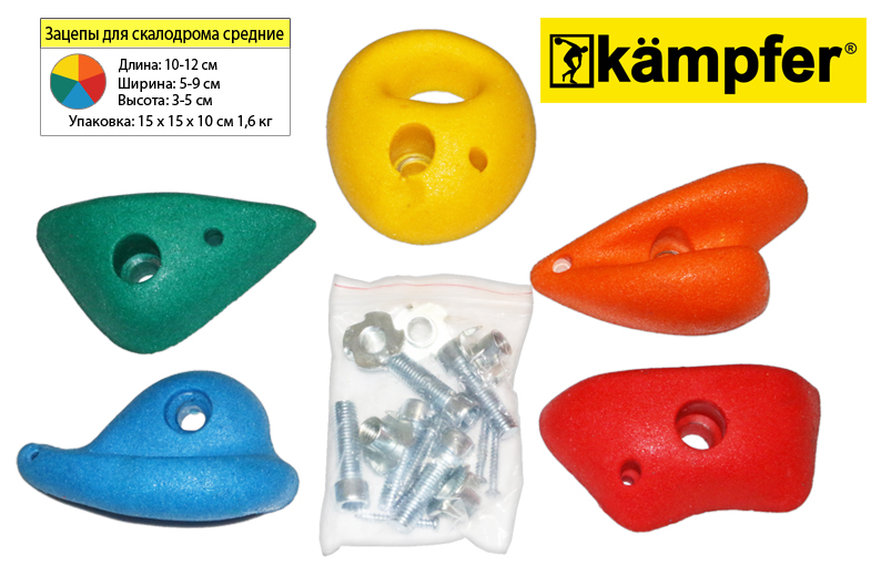 Средние зацепы Kampfer для детского скалодрома. Изготовлены из композитного материала. Внутри каждого зацепа находится металлическая шайба, в которую продевается болт. После этого болт вкручивается в металлический фиксатор, надёжно прикрепляющий зацеп к стене. Край зацепа фиксируется саморезом. В комплекте — пять зацепов разного цвета. Поставляются вместе с крепежной фурнитурой. Выдерживают нагрузку до 70 кг.
